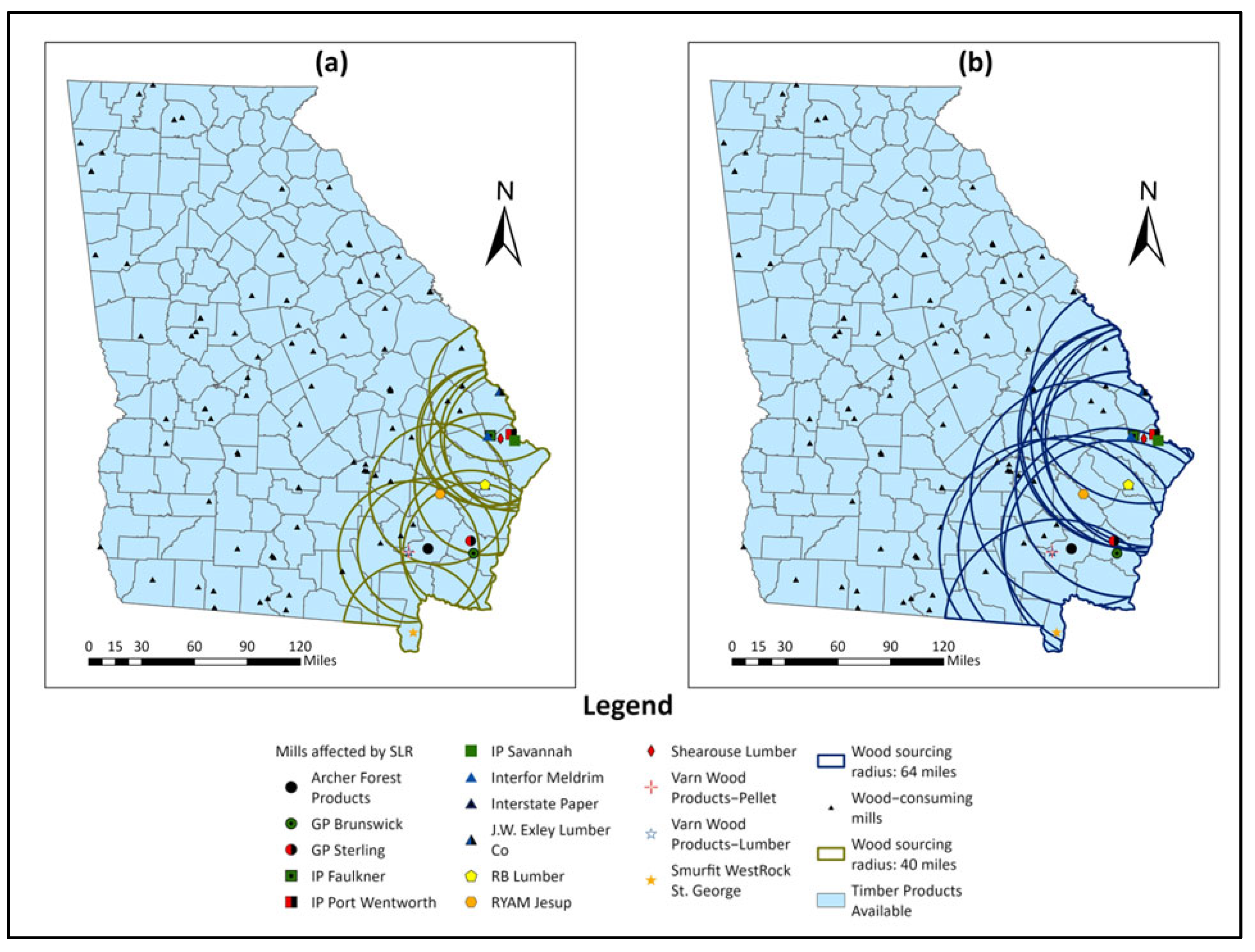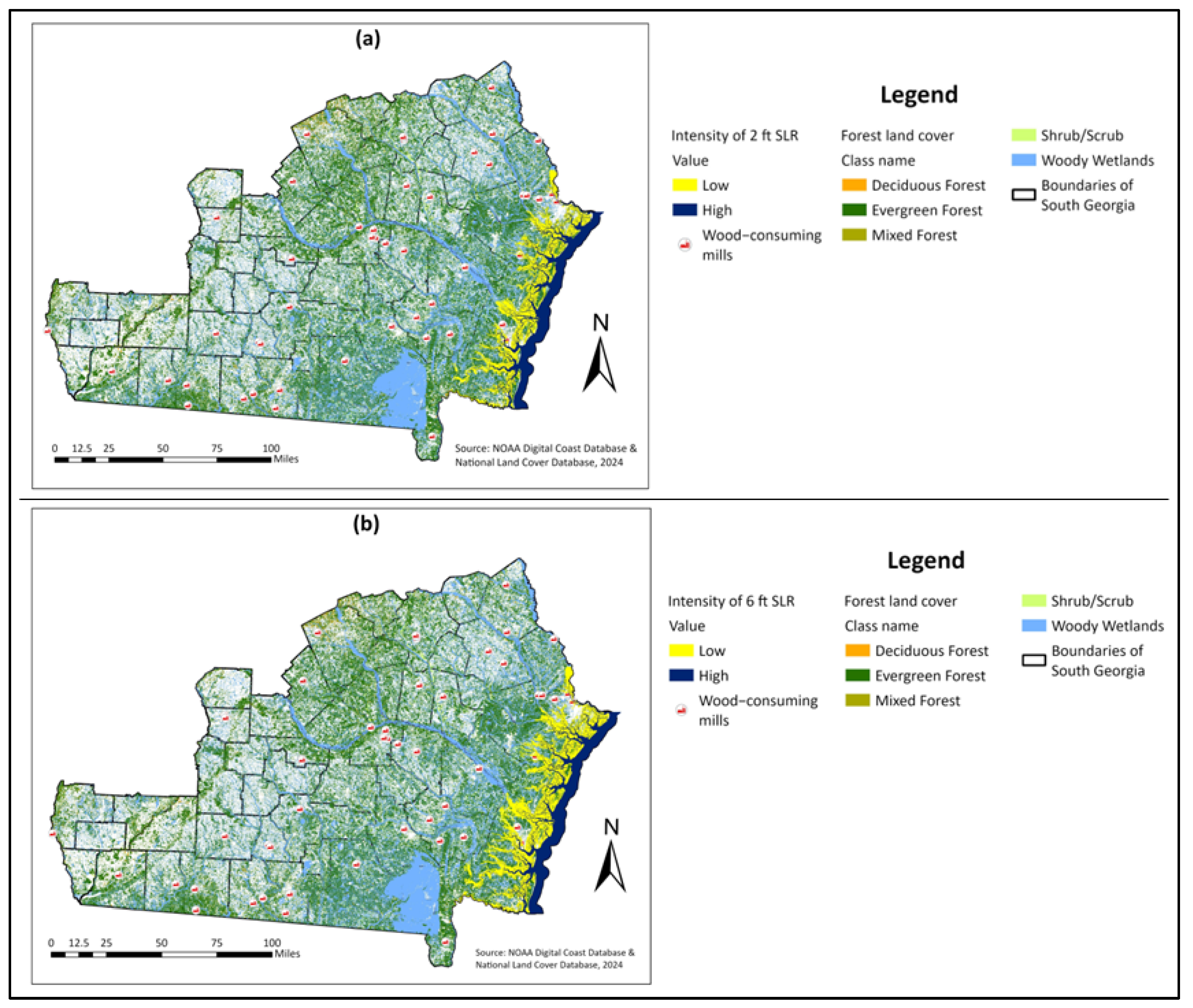 Against this background, we focus on location-dependent exposure of industrial wood procurement zones rather than landscape-wide forest loss, clarifying how proximity to projected inundation interacts with procurement radius. To the best of our knowledge, no study has calculated the impact of SLR-driven area loss on the wood procurement zones of wood-consuming mills in coastal areas. In this context, the objective of this study is to calculate the percentage of the total area of wood procurement zones flooded due to SLR for wood-consuming mills located in coastal counties of South Georgia. We specifically examine how impacts vary by mill location and procurement radius. We quantify the exposure of industrial wood procurement zones to SLR, providing a supply chain vulnerability perspective that—to our knowledge—has not been addressed for coastal Georgia. The results will guide policymakers in designing adaptive solutions to safeguard the forestry sector from the threats attributed to SLR.