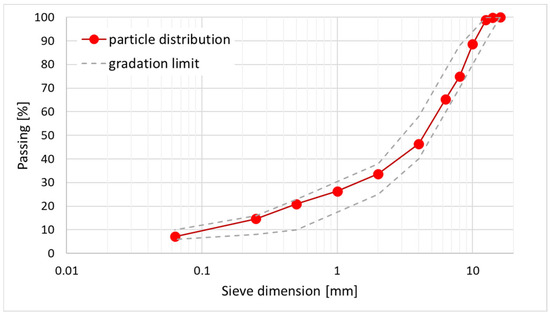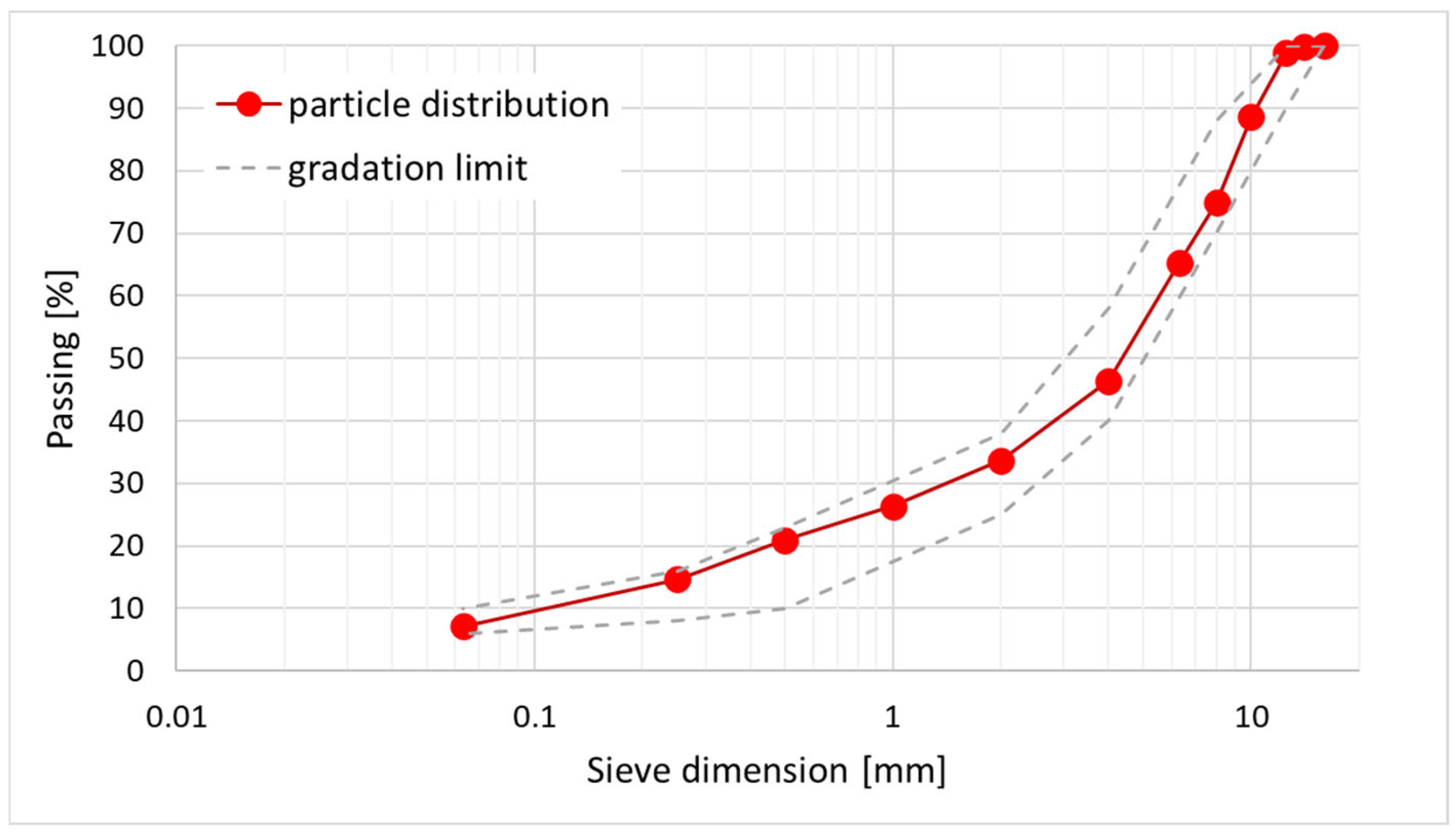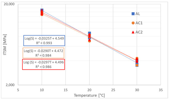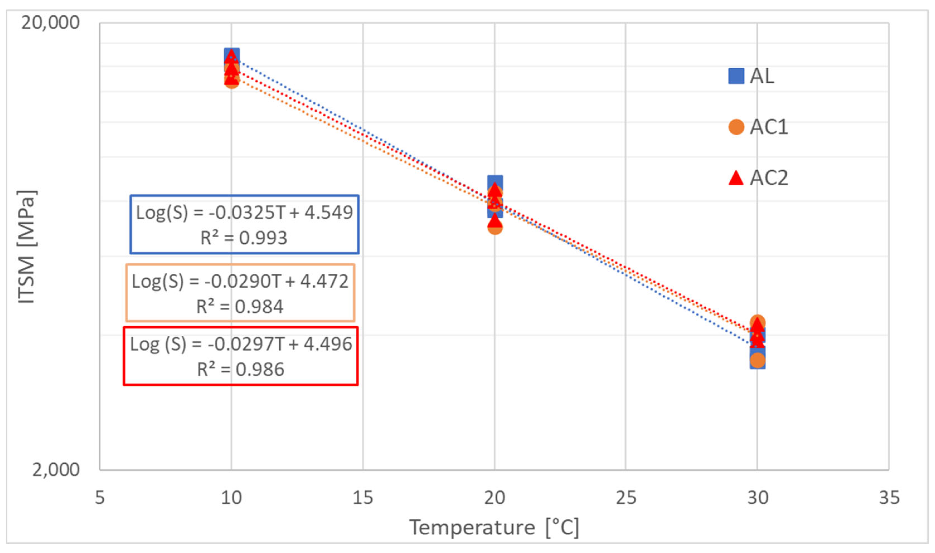 The evaluation of the dynamic behavior of the material is based on the indirect tensile stiffness modulus (ITSM) characterization, following the indirect tensile configuration on cylindrical samples (EN 12697-26, Annex C). Three gyratory specimens (80 gyrations) were prepared and tested. Furthermore, the tests were performed at different temperatures (10, 20, and 30 °C) in order to evaluate the thermal sensitivity of the material and its possible modification due to the filler substitution.