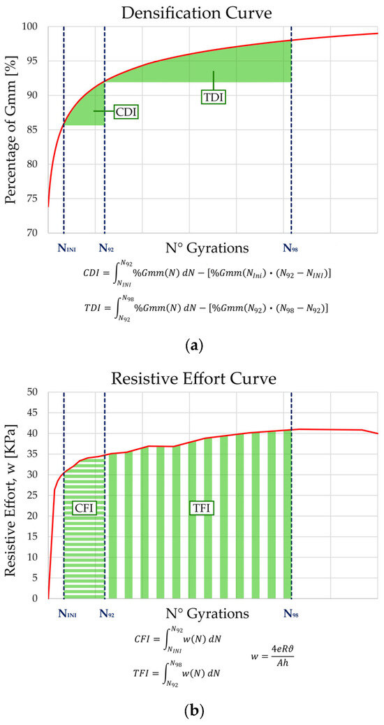 Figure 5, the densification indexes, such as the compaction densification index (CDI) and the traffic densification index (TDI), quantify the energy needed to reduce air voids or change the volume of the asphalt mixture and can be computed through integration. Concerning resistive effort curves, the compaction force index (CFI) and the traffic force index (TFI) can be defined. Both are indicative of mix stability and describe the mix’s resistance to distortion, specifically shear resistance. These are derived through integration, where the resistive effort (w) is a function of the machine parameters and the geometric properties of the test sample, calculated under the assumption that the material behaves as perfectly viscous or plastic [