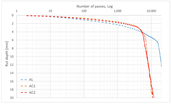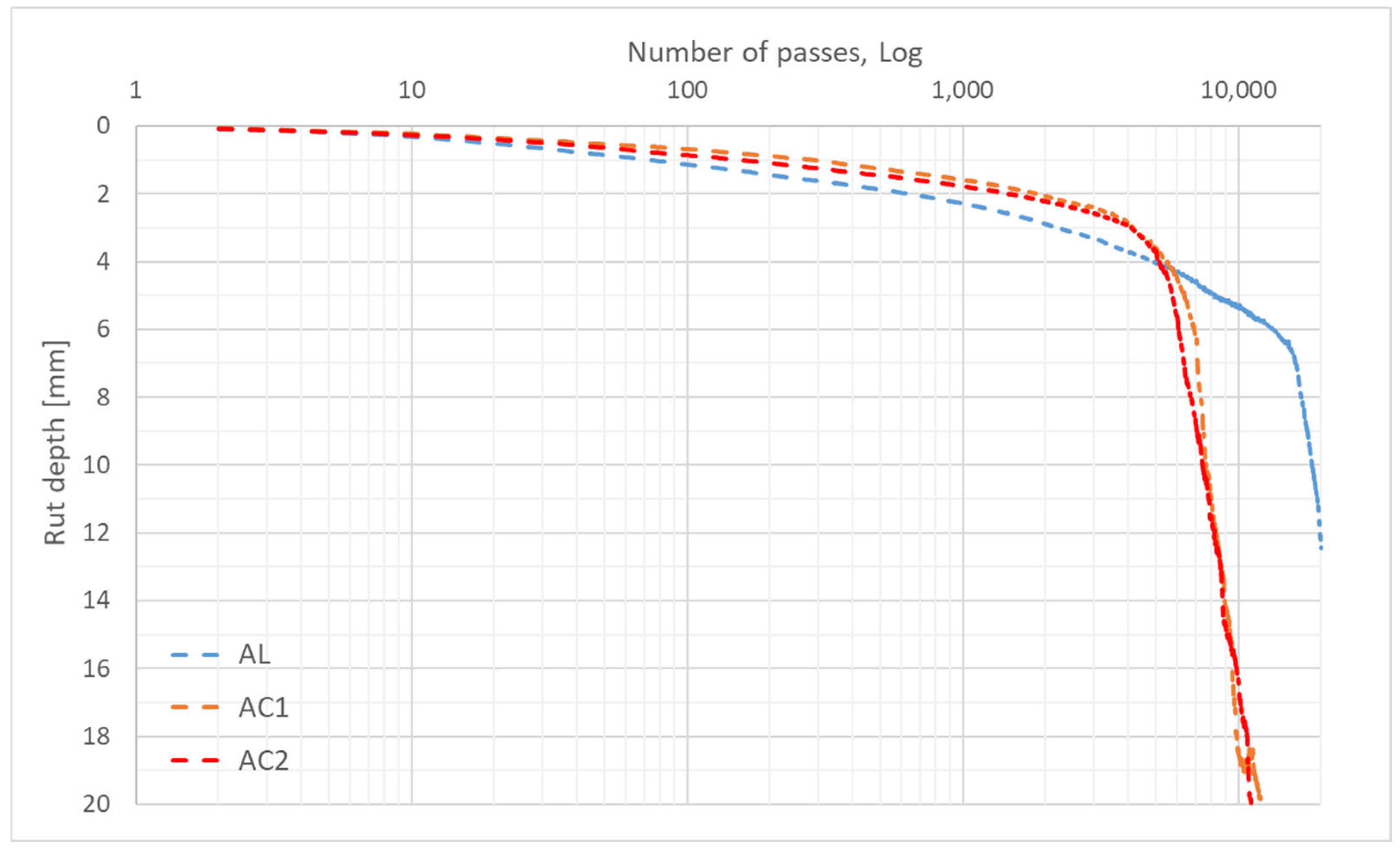 In the case under study, the creep stage is considerably limited for the AC1 and AC2 mixture, despite the rut depth recorded for both being lower than the AF. The SIP was recorded after 5998 and 5218 passes for AC1 and AC2, respectively. At this stage, the increase in the rut depth is coupled with the progressive dislodgement of aggregate particles from the sample’s surface. For the reference mixture, despite the higher displacement rate after the post-consolidation phase, the SIP was recorded after 17,050 passes, highlighting a better resistance to water damage. These data are in line with the trend verified during the water susceptibility test (ITSR), confirming the limited performance of the bituminous mixtures in terms of moisture damage resistance.