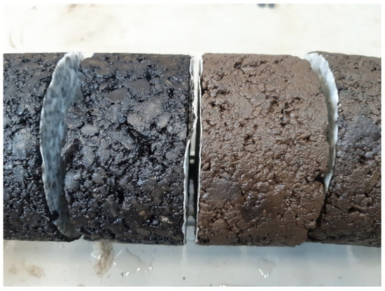 Figure 7, was modified in the experimental samples into a lighter coloration tending to brown. This phenomenon was verified for both AC1 and AC2 samples and might be related to the chemical properties of the waste powders, due to their cement-based composition. The same change in color is generally observable in cold mix asphalt (CMA) after curing, due to the interaction of bituminous emulsion and cement, and it is mainly related to the destabilization of asphalt emulsion by cement hydration [