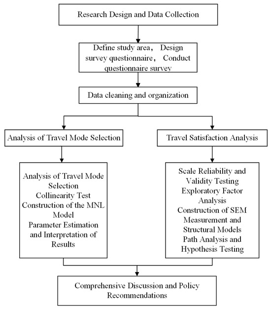 To systematically investigate the formation mechanisms of travel mode choice behavior and satisfaction among residents in low-density areas, this study constructs a mixed-methods framework integrating MNL and SEM. This framework aims to address the core research questions from two dimensions: objective behavioral decision-making and subjective psychological perception. As shown in Figure 1: