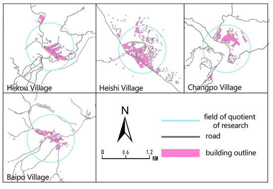 Existing research on the travel behavior of residents can be found to be more concerned about areas such as Shanghai and Jiangsu, in contrast to Western China where little in-depth research has been conducted. Located in the interior of northwest China, Lanzhou is the capital of Gansu Province and the core node city of the “Silk Road Economic Belt”. This paper focuses on the low-density rural area of Lanzhou City, which covers the county and part of the urban–rural transition zone in addition to the central city, accounting for 85.6% of the city’s administrative area. To analyze rural residents’ travel mode preferences and satisfaction, we conducted mixed-method surveys across four representative villages (Hekou, Heishi, Changpo, Baipo), establishing 1 km radius study zones from village centers (Figure 2). Structured questionnaires captured three dimensions: demographic characteristics, built environment perceptions, and mobility preferences. Combining household interviews with digital surveys ensured comprehensive data collection. Following rigorous researcher training and spatial sampling protocols, 204 valid responses were obtained from 212 collected questionnaires [43] (As in Appendix A).