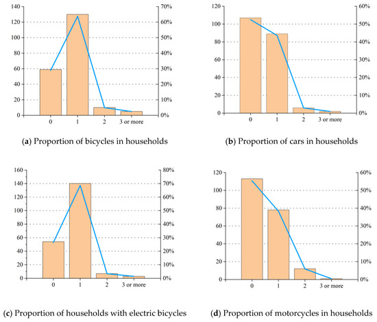 The main socio-demographic variables considered in this study include gender, age, place of residence, educational background, number of employed household members, annual household income, and number of vehicles per household. Initial analysis of the survey data reveals a higher proportion of female respondents compared to males, with seniors aged over 60 accounting for 23.04% of the rural participants. Due to the scarcity of quality educational resources and the absence of higher education institutions within rural China, many students pursue schooling outside their home regions. Economically, these areas rely heavily on agriculture, and non-agricultural employment opportunities are limited. Consequently, a significant portion of the labor force migrates for work, contributing to an aging local population. In terms of education, 64.22% of the respondents had attained a junior high school education or lower. The overall education level in the sample is relatively low, which corresponds to the older age demographic. Income-wise, most respondents reported an annual household income ranging between $20,000 and $50,000. Regarding health and mobility, a majority of rural participants reported being in good health. Private car ownership was reported by 46.63% of households, whereas 61.27% did not own a motorcycle. Over half of the households possessed either an electric or conventional bicycle, with electric bicycles being the most common, followed by bicycles, cars, and motorcycles. The modal share of travel modes is detailed in Figure 3. The socio-demographic profile of the respondents aligns with the general conditions in rural Lanzhou. Additional details on variable statistics are provided in Appendix B.