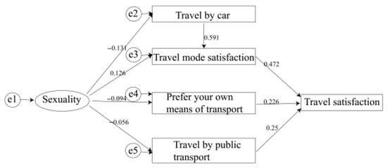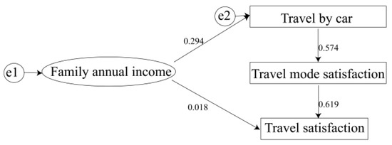 As shown in Figure 5, the model analyzes gender variables with women as the reference group, and the results show women’s travel satisfaction is lower than that of men. Rural women in China have less travel experience because they are more focused on household chores, plus they have less travel experience and are less satisfied with public transportation (gender, satisfaction with mode of travel and gender, satisfaction with public transportation, satisfaction with travel negatively affect travel satisfaction), resulting in lower overall travel satisfaction. Age exerts an adverse mediating effect on travel satisfaction, indicating that older individuals generally report lower satisfaction levels compared to their younger counterparts. This disparity can be attributed to the overrepresentation of older adults in rural regions, where limited transportation options are compounded by their greater familiarity with existing transit infrastructure. As a result, increased age restricts mobility choices, thereby reducing satisfaction. The primary pathway for this effect operates through the sequence: age → car access → travel mode satisfaction → overall travel satisfaction.