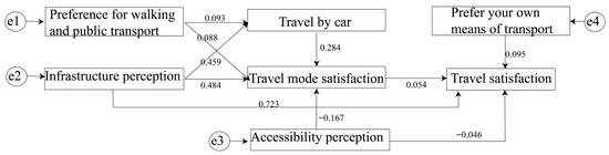 Similarly, the EFA for travel preferences also indicated strong factorability (KMO = 0.887, Bartlett’s test p < 0.001). Varimax rotation revealed a two-factor structure explaining 67.637% of the total variance. The first factor reflected Preference for Own Transport, with high loadings from items such as driving, motorcycle, electric bicycle, bicycle, and tricycle use. The second factor, Preference for Walking and Public Transport, was defined by items including public transport use, walking, and other alternative modes. Detailed loadings are presented in Table 2.