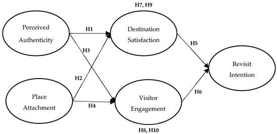While destination satisfaction and visitor engagement have been shown to positively affect revisit intention in various studies, several scholars have further demonstrated that both constructs can serve as psychological pathways linking perceived authenticity and place attachment to revisit intention [10,14,15,32,50]. In particular, satisfaction with museum experiences and other cultural heritage sites that are often enhanced by perceptions of authenticity and engaging interactions indirectly increases the likelihood of repeat visits [8,14,15,32,50,51]. Similarly, visitor engagement has been found to indirectly strengthen the intention to revisit through the influence of perceived authenticity and place attachment [10,14,50,52]. Notably, most prior research has examined these mediating roles separately, leaving a gap in understanding their combined effects. To address this gap, the present study investigates whether the simultaneous consideration of destination satisfaction and visitor engagement offers a more comprehensive explanation of understanding revisit intention of visitors to the Chinese Palace Museum. Accordingly, the following hypotheses were created to test the assumptions created: