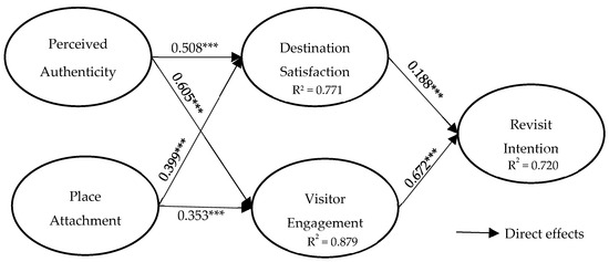 Further, the structural model shows that the hypothesized relationships were statistically significant and supported. Perceived authenticity demonstrated a significant positive effect on destination satisfaction (β = 0.508; t = 10.544; p < 0.001). On the other hand, place attachment also has a direct positive effect on destination satisfaction (β = 0.399; t = 8.164; p < 0.001). In terms of visitor engagement as a dependent variable, perceived authenticity and place attachment also have a significant positive effect (β = 0.605, t = 16.644, and p < 0.001, and β = 0.353, t = 9.608, and p < 0.001, respectively). Furthermore, destination satisfaction was found to positively affect revisit intention (β = 0.188; t = 3.336; p < 0.001), indicating a support on the hypothesis. Visitor engagement had the strongest direct effect on revisit intention (β = 0.672; t = 12.846; p < 0.001), underscoring the critical role of active involvement and participation in fostering visitors’ intentions to revisit.