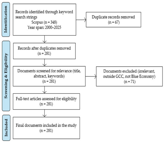 The first stage involved a systematic search of the Scopus database, selected for its broad interdisciplinary coverage and strong indexing of peer-reviewed literature in marine, environmental, and policy-related domains [44,45]. The search period spanned 2000 to 1 June 2025, thereby capturing long-term scholarly trajectories and the post-2015 acceleration in research following the adoption of the Sustainable Development Goals (SDGs) and national strategies such as Saudi Arabia’s Vision 2030 and the UAE Blue Economy Strategy 2031. The search was carried out in Scopus across title, abstract, and keywords fields. The Boolean search string was designed to capture the breadth of Blue Economy scholarship in the GCC context: [(“blue economy” OR “marine economy” OR “coastal economy” OR “ocean economy”) AND (“Gulf” OR “GCC” OR “Arabian Gulf” OR “Persian Gulf” OR “Saudi Arabia” OR “United Arab Emirates” OR “UAE” OR “Oman” OR “Qatar” OR “Bahrain” OR “Kuwait”)].