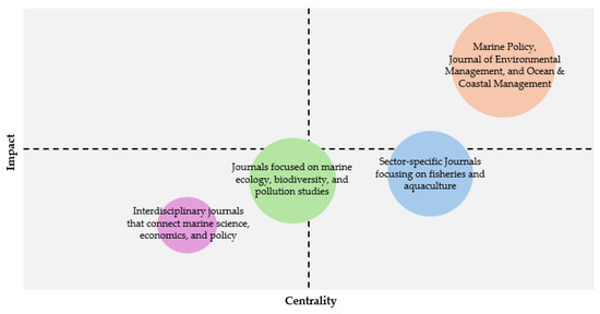 In Figure 3, the clusters are formed according to the sources (journals) measured by author keywords [44,45]. The analysis highlights the journals that have made the most significant intellectual contributions to the 210 sample studies on the Blue Economy within the GCC context. The first cluster is located in the first quadrant and represents the motor themes (MT). This cluster includes Marine Policy, Journal of Environmental Management, and Ocean & Coastal Management as the most influential journals in the field. The cluster has a centrality of 5.87 and an impact of 1.02, reflecting its well-established role in shaping debates on marine governance, sustainability, and coastal policy. The second cluster, found in the second quadrant and colored in blue, corresponds to the niche themes (NT). It contains specialized outlets focusing on fisheries and aquaculture, many tied to Saudi and Omani case studies. This cluster has a frequency of 9, a centrality of 1.14, and an impact of 1.00, reflecting its sector-specific but regionally critical relevance. The third cluster, in the third quadrant and represented in green, signifies emerging or declining themes (EDT). This group consists of journals focused on marine ecology, biodiversity, and pollution studies, with a frequency of 10, a centrality of 2.38, and an impact of 1.00. These outlets reflect fluctuating research attention in areas linked to environmental degradation and climate stressors in the Arabian Gulf. The fourth cluster, situated in the fourth quadrant and colored in purple, represents the basic themes (BT). It includes interdisciplinary journals that connect marine science, economics, and policy, with a frequency of 5, a centrality of 2.47, and an impact of 1.00. While less developed in volume, these journals underscore potential growth areas for integrating ecological insights with governance and financial innovation. This analysis leads to the inference that Marine Policy, Journal of Environmental Management, and Ocean & Coastal Management are currently the most influential and well-developed outlets for Blue Economy research in the GCC, while specialized and interdisciplinary journals hold considerable promises for advancing future debates.