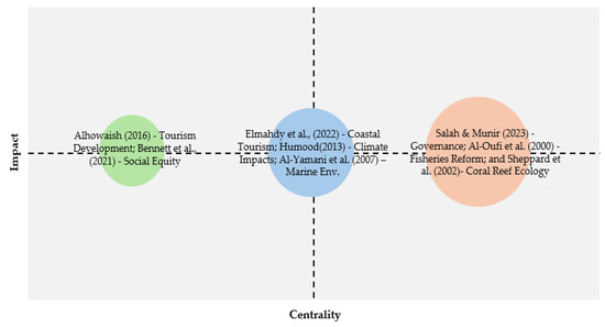 In Figure 4, the clusters are formed according to the documents (articles) that are measured by author keywords [44,45,59]. This analysis acknowledges the articles that have made crucial intellectual contributions to the 210 samples included in this study. The first cluster is located across the first and fourth quadrants, representing the motor themes (MT) and basic themes (BT). The frequency of this cluster is 31, with a centrality of 1.34 and an impact of 1.00. The top three articles in this group include Salah & Munir [36] on Blue Economy governance, Al-Oufi et al. [25] on fisheries reform in Oman, and Sheppard et al. [21] on coral reef ecology in the Arabian Gulf. These studies form the intellectual backbone of Blue Economy research in the GCC. The second cluster is located in the second and third quadrants, colored in blue, and represents the niche themes (NT) and emerging/declining themes (EDT). This cluster has a frequency of 19, with a centrality of 1.12 and an impact of 1.00. It includes specialized studies on marine pollution, aquaculture practices, and coastal tourism, which, while significant, remain more sector-specific in focus. The third cluster, shown in green, represents mixed themes spanning all quadrants. It has a frequency of 28, with a centrality of 1.23 and an impact of 1.00. The studies here are diverse, covering blue finance, climate adaptation, and social inclusion, reflecting the field’s expansion into new interdisciplinary directions. This analysis suggests that Salah & Munir [36], Al-Oufi et al. [25], and Sheppard et al. [21] stand out as the most influential and visionary contributions to Blue Economy scholarship in the GCC, anchoring an evolving research field that continues to diversify into governance, resilience, and finance.