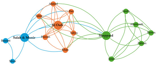 - Cluster 1 (red): comprising seven authors, mainly associated with research on marine governance and fisheries reform in Oman and Saudi Arabia.