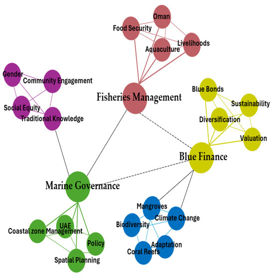 Network visualization of the co-occurrence of keywords. This network shows how keywords co-occur across publications [62,63]. Larger nodes represent frequently used keywords, while color-coded clusters reveal major thematic areas such as fisheries, governance, climate resilience, and finance.