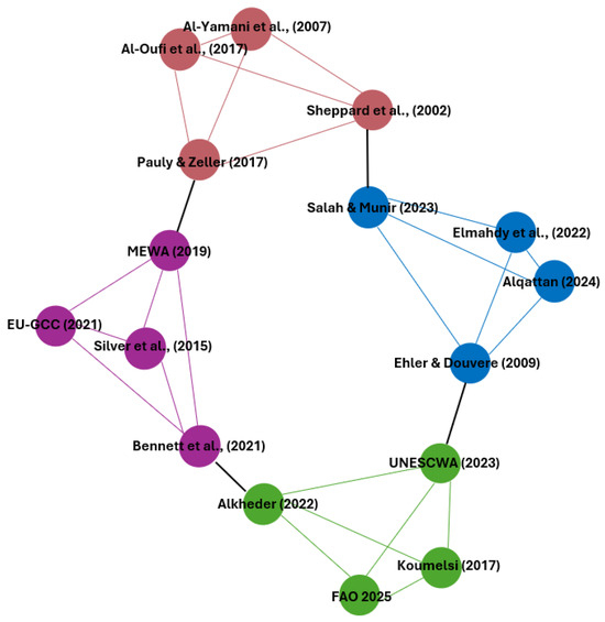 Overall, the co-citation analysis underscores the multidisciplinary nature of Blue Economy research in the GCC, with clusters spanning ecological science, governance frameworks, climate adaptation, and finance/society. The presence of these interconnected yet distinct themes illustrate how Blue Economy scholarship has evolved from ecological roots toward a broader, policy-relevant, and inclusive development paradigm.