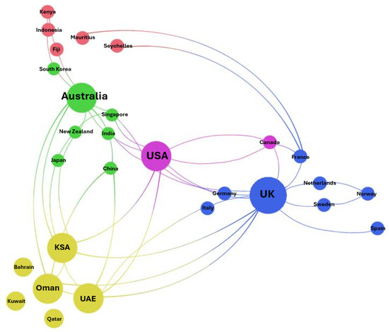 Finally, the international collaboration network of countries, illustrated in Figure 9, reveals five distinct clusters that structure Blue Economy research in the GCC context. Cluster 1 (blue) consists of leading European contributors such as the UK, France, Germany, and the Netherlands, which form a central hub in governance and marine policy research. Cluster 2 (purple) represents North America, with the USA and Canada emerging as highly connected actors, particularly in financing, biodiversity, and global sustainability linkages. Cluster 3 (green) encompasses Asia-Pacific countries including Australia, China, India, Japan, and Singapore, which demonstrate strong roles in marine ecology, aquaculture, and climate adaptation studies. Cluster 4 (yellow) brings together the GCC states, Saudi Arabia, the UAE, Oman, Qatar, Bahrain, and Kuwait, reflecting their growing leadership in fisheries reform, aquaculture, and marine spatial planning. Finally, Cluster 5 (red) groups Climate and Small Island Partners such as Kenya, Seychelles, Mauritius, Fiji, and Indonesia, highlighting their engagement in climate resilience, marine biodiversity, and nature-based solutions.