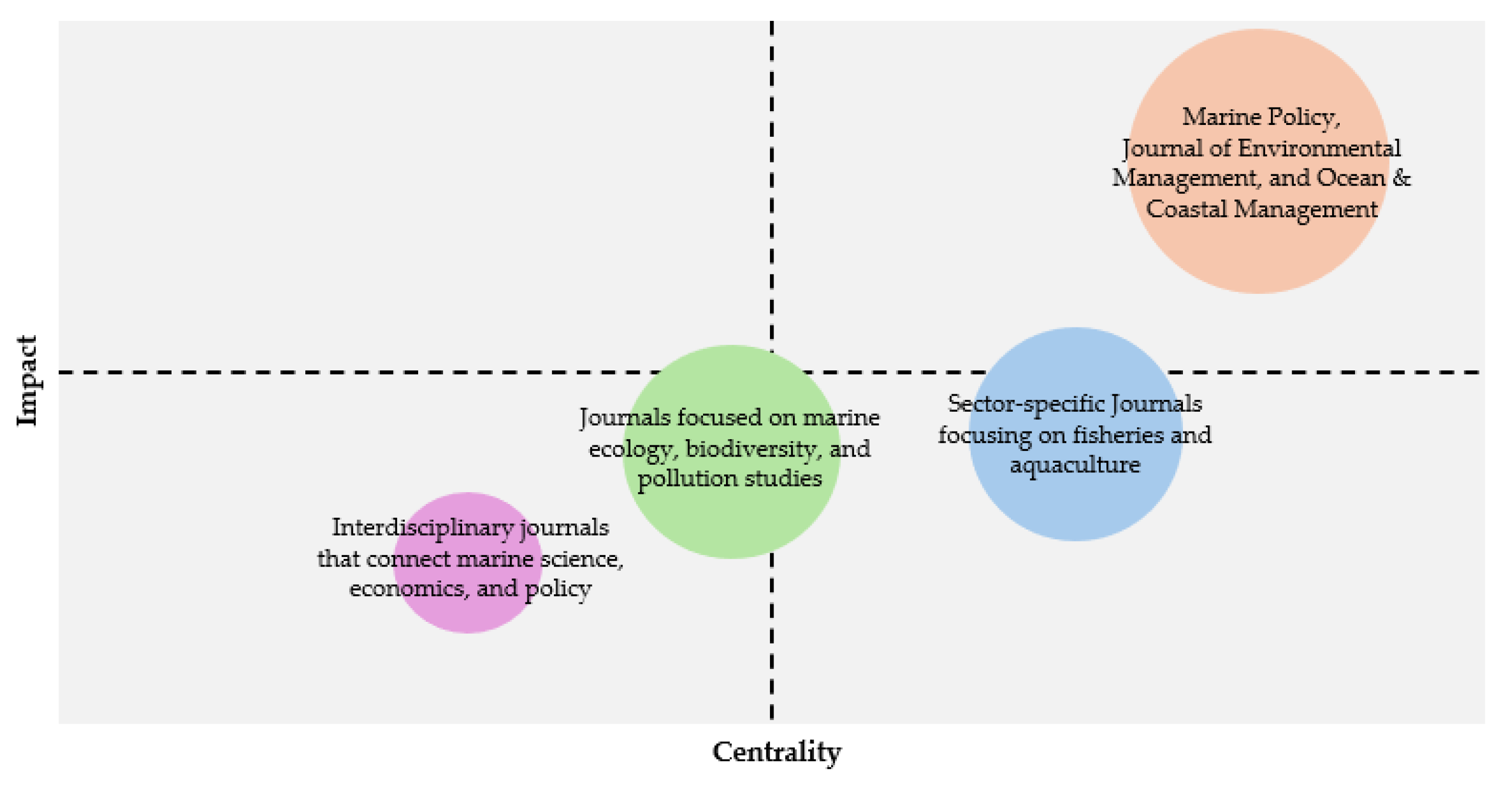 Bibliographic coupling clustered journals and articles based on their impact and centrality, revealing the intellectual structure of Blue Economy research. Leading journals such as Marine Policy, Ocean & Coastal Management, and Journal of Environmental Management emerged as motor themes, underscoring their importance for publishing work on governance, sustainability, and resource management. Highly cited contributions included Sheppard et al. [