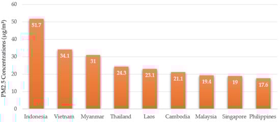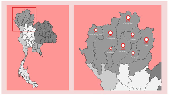 - Amnuaylojaroen, T.; Sornpoon, W.; Cheewaphongphan, P. Children’s Health Risks from Seasonal PM2.5 in Northern Thailand. Int. J. Environ. Res. Public Health 2023, 20, 11231. [Google Scholar]