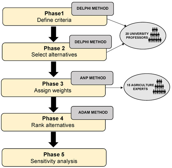 The first phase focused on defining the criteria that would guide the evaluation. Since the selection of an alternative crop requires balancing multiple dimensions, the Delphi Method was used to identify the most relevant criteria through an expert-driven consensus process. A multidisciplinary panel participated in multiple iterative rounds, progressively refining the criteria based on structured feedback. The final set of criteria encompassed economic, environmental, and social factors, ensuring a comprehensive evaluation framework.