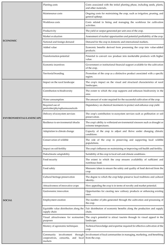 Based on the methodology outlined in Section 2, a structured framework for the evaluation of the most sustainable and strategic crop alternatives has been defined. The adopted model is divided into three main dimensions—economic, environmental/landscape and social—each of which includes ten specific sub-criteria that reflect the most relevant aspects for a holistic and multidimensional analysis of the crop choice (Figure 2).