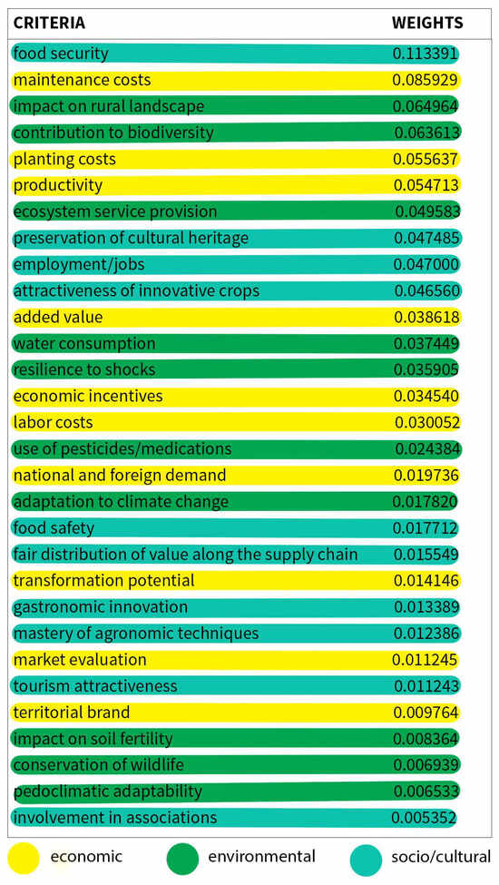 Specifically, among the 30 sub-criteria assessed, food security (socio-cultural dimension) was ranked highest. This outcome reflects the experts’ focus on ensuring continuous, reliable access to sufficient and nutritious food in response to the disruption caused by the Xylella fastidiosa epidemic, which significantly compromised the traditional local agri-food systems. Ranked second was the maintenance costs criterion (economic dimension), defined as the expenses incurred by farmers to maintain optimal production conditions, including water management, fertilization, pesticide applications, and harvesting practices. The prominence assigned to this factor highlights the importance attributed by experts to the economic feasibility of alternative crops, particularly given the relatively low operational costs historically associated with olive cultivation. In third place, experts positioned the impact on the rural landscape (environmental dimension).