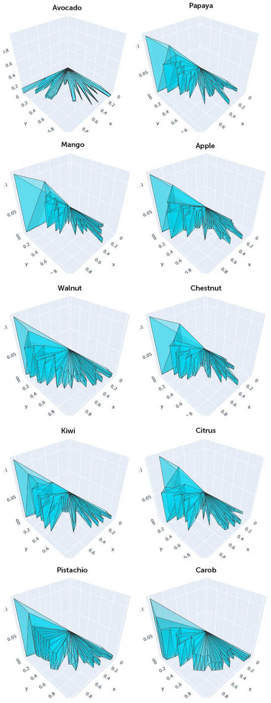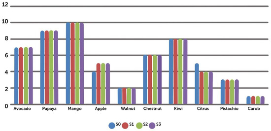 Following the definition of the evaluation framework, and following the process described in Section 2.2, the ten alternative crops most suitable for replacing the olive tree in Salento were identified as follows: (i) avocado, (ii) papaya, (iii) mango, (iv) apple, (v) pistachio, (vi) walnut, (vii) chestnut, (viii) kiwi, (ix) citrus (lemon, tangerine, orange), (x) carob.