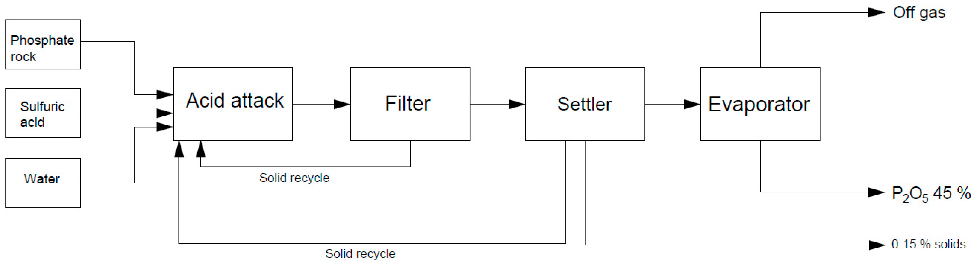 | Hemi-dihydrate Process | Hemihydrate–Dihydrate | 40–46% | >98.5% | After the first reaction in hemihydrate mode, the product acid is separated as a 46% P2O5. The remaining α-hemihydrate is further processed with sulfuric acid in conditions in which α-hemihydrate is unstable and recrystallizes as gypsum, releasing crystallized and unreacted P2O5. |