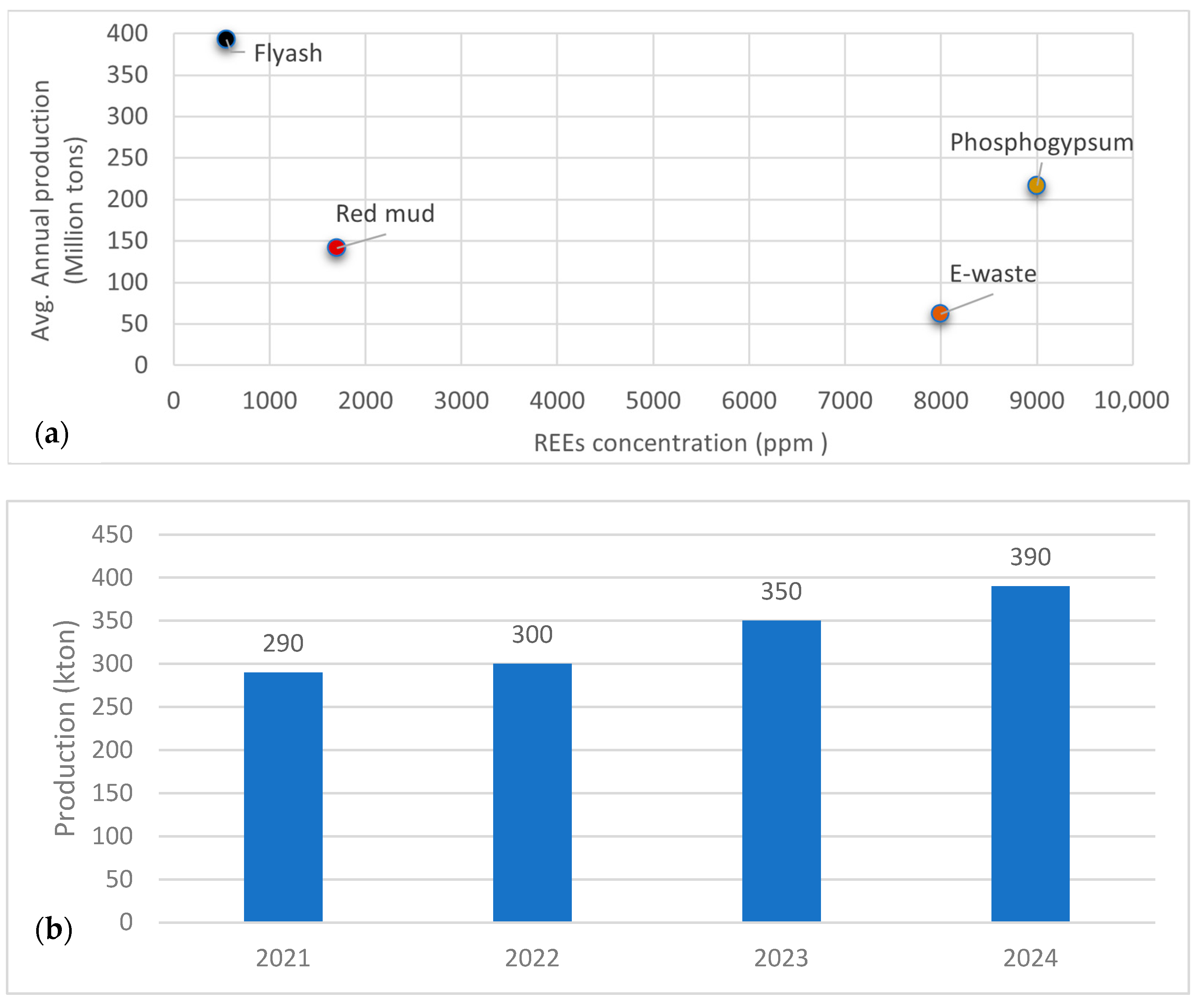 - Industrial bottlenecks: The very low concentration of REEs in PG (generally 0.2–1 wt% of total PG, often < 0.1% recoverable), the need to process large volumes of waste, high chemical consumption, scaling issues when moving from batch leaching to continuous systems, and the lack of standardized pretreatment methods to handle impurities and radionuclides.