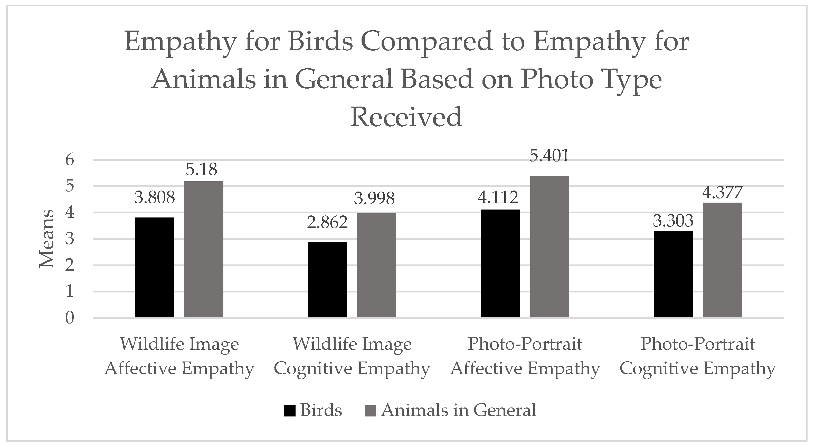 4.2. Comparison of Empathy for Birds and Empathy for Animals Broadly