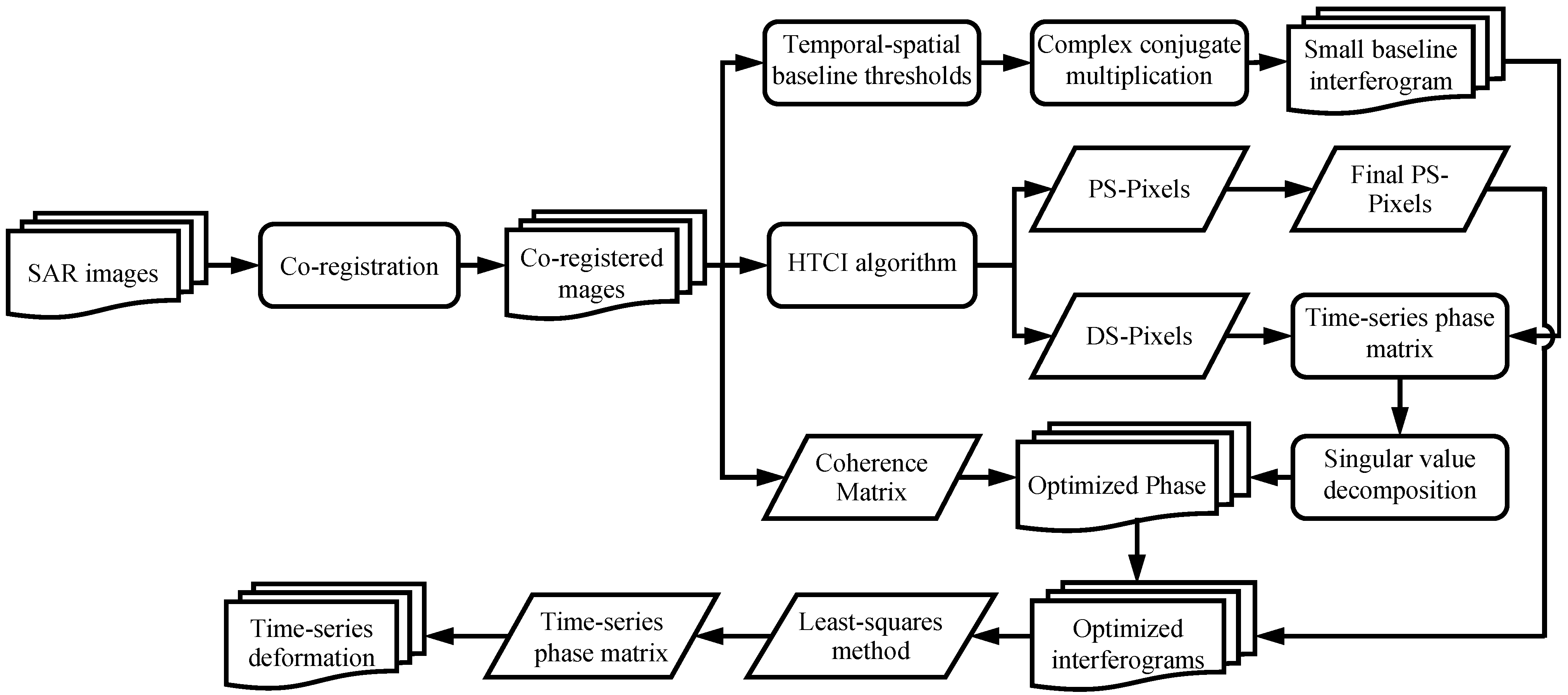 2.1. Small-Baseline Subset and Distributed-Scatterer Interferometric Synthetic Aperture Radar
