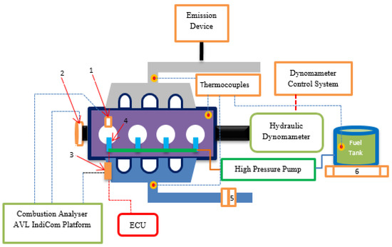Schematic view of experimental setup: (1) AVL Glow-plug sensor, (2) AVL crank angle encoder, (3) current probe, (4) common Rail Injector, (5) air mass flow meter, (6) electronic scale.