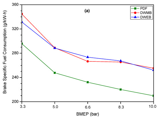 As seen in the graph, PDF exhibited lower BSFCs than microemulsifications at all loads. However, this distinction became more pronounced with BMEP. At 3.3 bar, BSFC of DWMB and DWEB was 16.51% and 12.09% higher than PDF, respectively, while this difference increased to 21.64% and 20.16% at 10.0 bar. However, it is noteworthy that the difference between BSFCs of microemulsification fuels and PDF was greater than the difference between their heating contents (11.81% and 9.16% less calorific value for DWMB and DWEB, respectively). This may be due to emulsification fuels’ relatively high viscosity and density, reducing atomization quality and combustion efficiency. Moreover, lower combustion chamber temperature caused by high latent heat of vaporization of alcohols and WFO’s poor volatility may have also been influential in these results. Comparing microemulsification fuels, it is seen that BSFCs were quite close to each other (the largest difference was 13.07 g/kWh at 3.3 bar). Although the calorific value of DWMB was about 2.92% lower than DWEB, its relatively better viscosity may have compensated for this difference. Ooi et al. [31], Bidir et al. [32], and Kolhe et al. [33] have reported similar results in their articles.