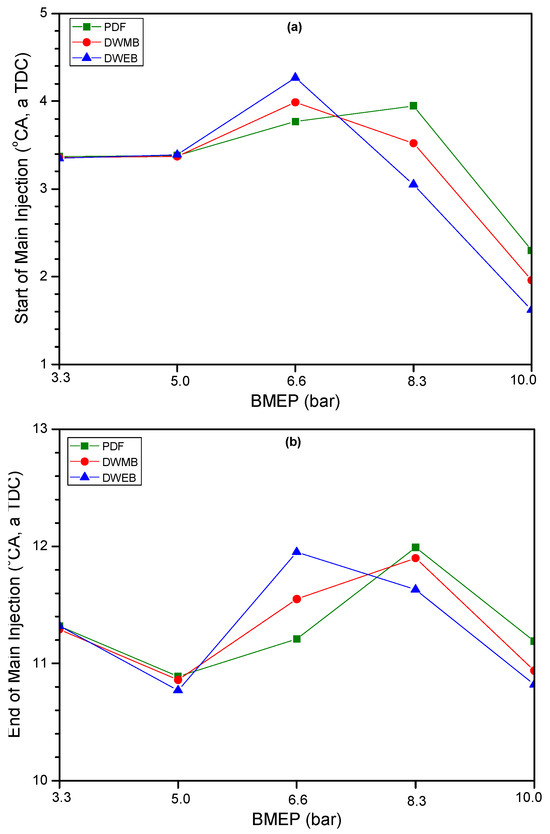 As seen in Figure 4a,b, sMI and eMI timings were generally similar. With increasing BMEP, main injection timings advanced. As load increases, more energy is required and therefore more fuel needs to be injected. To finish the combustion as close to TDC as possible, electronic control unity (ECU) has advanced sMI and eMI. At 3.3 and 5.0 bar, sMI and eMI were identical; however, as BMEP increased, main injection timings of emulsification fuels became more advanced. Since calorific values of DWMB and DWEB are lower, more fuel mass must be injected. Consequently, ECU advanced main injection timings of emulsification fuels to finish combustion of more fuel closer to TDC, where pressures and temperatures are higher. Quaternary fuels’ relatively earlier injection timings affect combustion and emission characteristics, and this will be discussed in related sections. At low BMEPs, main injection timings of emulsification fuels were very close, while as BMEP increased, sMI and eMI of DWEB were slightly more advanced than DWMB.