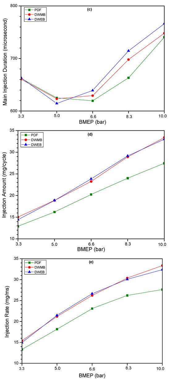 - All fuels’ pilot and main injection timings were very close at low BMEPs. However, with increasing load, quaternary fuels’ injection timings were relatively earlier than PDF.