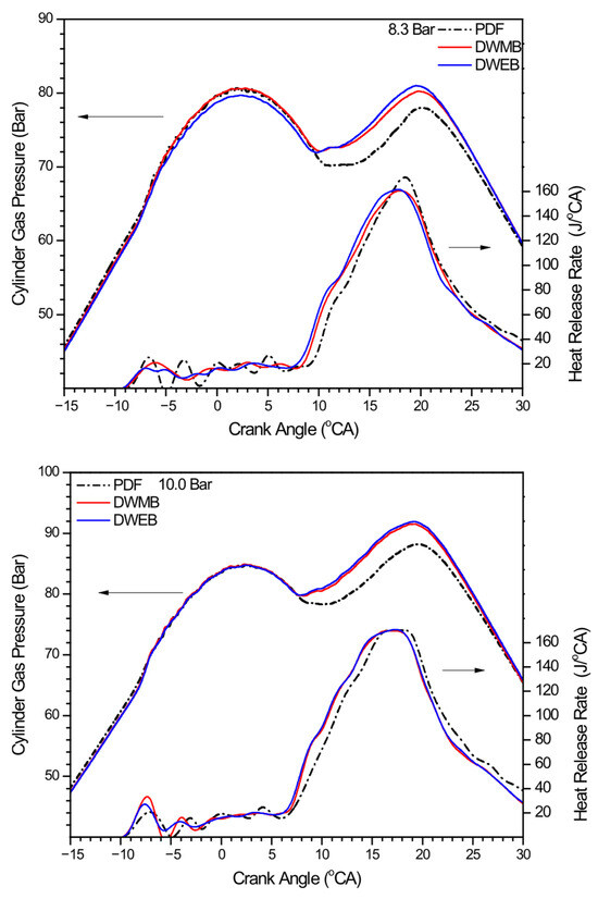 As Figure 5 illustrates, in-cylinder gas pressures increased with BMEP. The higher injection pressures and effective swirl at high loads enhance air–fuel formation and mixture homogeneity. Since the test engine is a turbocharged engine, more air will enter cylinders with increasing BMEP, resulting in better combustion and higher temperatures–pressures. While the pressures reached at the first peak were higher for the first three BMEPs, higher pressures were obtained at the second peak at 8.3 bar (for emulsification fuels) and especially at 10.0 bar. As mentioned before, with increasing BMEP, PID decreased whereas MID significantly increased. This situation can explain the pattern change in pressure curves. Although there was no significant difference between pressures obtained at the first peak (almost the same pressures at 8.3 bar and especially at 10 bar), higher pressures were reached with emulsification fuels at the second peak (except for 3.3 bar), and this difference became more pronounced with load. This result may be emanated from earlier injection timing for quaternary fuels and also the change in IR, IA, and MID. The difference between pressures of emulsified fuels (except 3.3 bar) was considerably less than the difference between them and PDF. Especially at 10 bar, almost the same pressure curves were obtained with DWEB and DWMB.