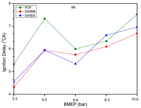 As seen in Figure 6a, ignition delay (ID) periods increased with BMEP for all fuels except the decrease at 6.6 bar. Despite parameters reducing ID, such as higher in-cylinder temperatures, injection pressures, air mass flow, and more effective swirl reached at high BMEPs, longer ID can be explained by significant increases in sMI and IA.