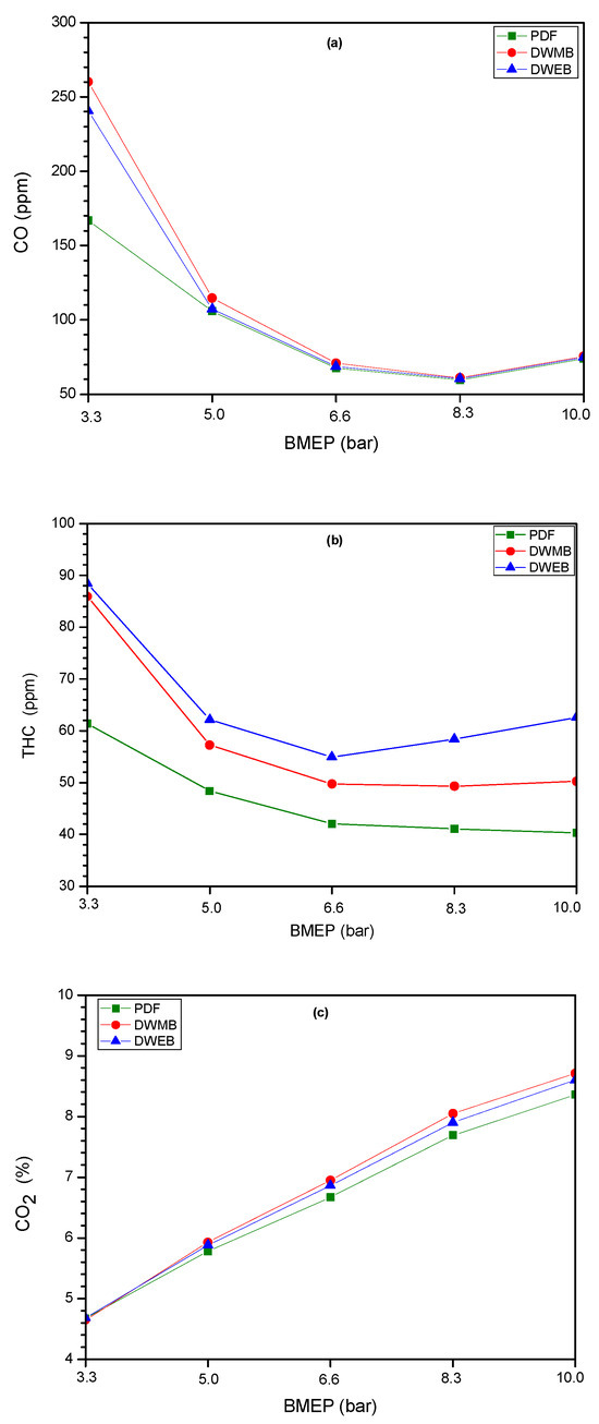 THC emissions of DWEB were higher than DWMB at all BMEPs. However, this difference was especially increased at the last two loads (from 2.93% at 3.3 bar to 24.63% at 10.0 bar). This may be due to DWEB’s relatively high viscosity and surface tension. Furthermore, DWEB was injected at earlier crank angles, with lower pressure for longer duration. This slight difference in injection characteristics may also have contributed to high THC.