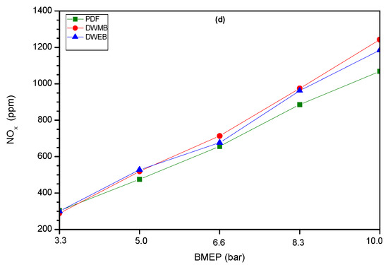 NOx emissions are the most critical emission type for diesel engines. The three main causes of NOx are combustion temperature, combustion duration, and oxygen concentration in the flame zone [51]. As Figure 7d shows, NOx emissions increased significantly with engine load. The rise in NOx emissions between highest and lowest BMEPs was 251.87%, 330.35%, and 294.33% for PDF, DWMB, and DWEB, respectively. The main reason for this dramatic rise is elevated in-cylinder temperatures at high loads. With increasing BMEP, higher air mass flow, enhanced turbulence, increased injection pressure, earlier fuel injection, and decreased CD lead to rapid energy release, promoting thermal NOx formation [52].