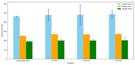 Figure 2 displays the average dimensions (length, width, and height) of bricks containing 5%, 10%, and 15% PET, produced using a custom mold measuring 240 mm × 130 mm × 100 mm. Error bars indicate the variability ranges. A commercial control brick—REX brand, King Kong type with 18 holes—is also included, though its dimensions differ from the experimental mold due to the absence of such molds in standard manufacturing. Overall, the experimental bricks show average dimensions close to the mold specifications, but variability—particularly in length—tends to increase with higher PET content. The control brick reflects the consistency typical of industrial production. These findings suggest that incorporating PET may compromise dimensional uniformity in molded bricks compared to commercially manufactured counterparts.