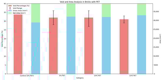 Figure 3 illustrates how the incorporation of PET affects the internal structure and surface area of bricks. The left axis displays the void percentage, with the control brick (0% PET) showing the highest value at 35%. As PET content increases to 5%, 10%, and 15%, the void percentage decreases slightly, stabilizing between 31% and 32%. Error bars indicate the variability within each category, which tends to narrow as PET content rises. The right axis presents the gross surface area in mm2, which increases progressively with PET incorporation—from approximately 28,789 mm2 in the control sample to over 32,800 mm2 in the 15% PET brick. The net surface area, represented by the upper portion of the stacked bars, remains constant across all samples. This suggests that the increase in gross area is primarily due to reduced porosity and expanded external volume. Overall, the data indicate that PET contributes to greater material densification and dimensional expansion, with the most pronounced effects observed at lower incorporation levels. Beyond 10% PET, improvements in compaction and structural uniformity appear to plateau under the tested manufacturing conditions.