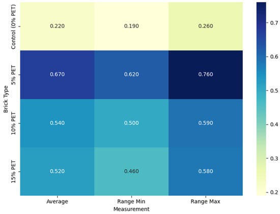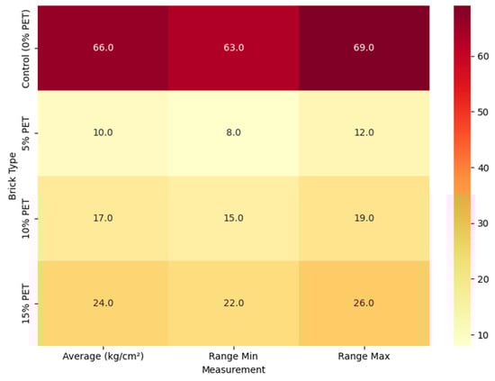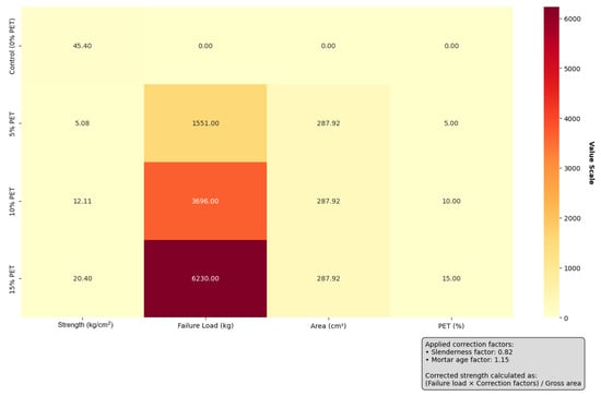 Figure 10 provides a comprehensive statistical matrix summarizing the results of axial compression tests conducted on masonry prisms incorporating varying percentages of recycled PET. The control group (0% PET) is compared against specimens containing 5%, 10%, and 15% PET. The matrix includes key parameters: average compressive strength (kg/cm2), average failure load (kg), gross area used for calculations (cm2), and PET content. It is clearly observed that the control prisms without PET exhibit the highest compressive strength (45.40 kg/cm2). The inclusion of PET leads to a significant reduction in strength compared to the control; however, a rising trend in both compressive strength and failure load is noted as the PET content increases from 5% to 15%. The heatmap employs a color scale ranging from yellow (lower values) to dark red (higher values), facilitating visual comparison of data magnitudes across the different prism categories. Corrected strength values were obtained by applying slenderness (0.82) and mortar age (1.15) correction factors to the failure load divided by the gross area.