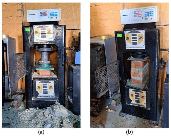 Mechanical tests for compressive strength were conducted both on individual bricks () and on prism Compressive Strength (), using a Cardinal 204 V compression device (Weaver, MO, USA), in accordance with NTP 399.605 [49] and ASTM C67 [36].