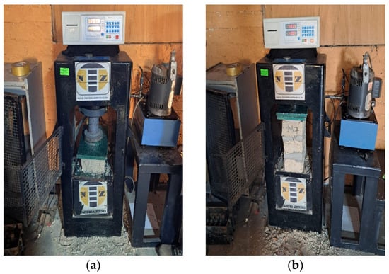 Modified Bricks: (a) Unit compressive strength test () of the individual brick; (b) Prism Compressive Strength test of brick prisms ().