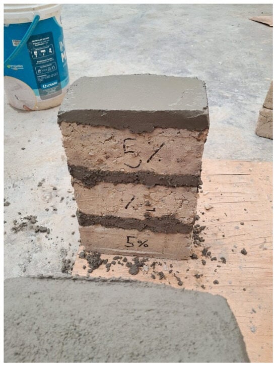 The fabrication process began with material preparation: the clay was sieved using a No. 4 mesh, and the recycled PET plastic was sieved with a No. 8 mesh. Although mechanical grinding of the clay was not performed due to equipment limitations, the sieving allowed for initial particle homogenization. Next, the dry components (clay and PET) were mixed until a uniform mass was obtained. Water was gradually added in a mixing tray until the desired workability was achieved. Molding was carried out using custom-made iron molds (23 cm long, 12.5 cm wide, and 9 cm high) to ensure dimensional accuracy. Fine sand was used as a release agent to facilitate demolding without deformation. After molding, the bricks were air-dried for 24 h and then stored under cover for controlled curing over 28 days, with periodic hydration. For the compressive strength tests, masonry stacks were built using a 1:4 mortar mix (cement:sand), in accordance with Standard E.070 [26]. The bricks were moistened prior to laying to improve adhesion, maintaining a mortar thickness of 1.5 cm between courses. A total of nine stacks were constructed—three for each PET percentage—ensuring vertical alignment and consistent height using a plumb line and gauge rod. The stacks were also water-cured for 28 days before testing.