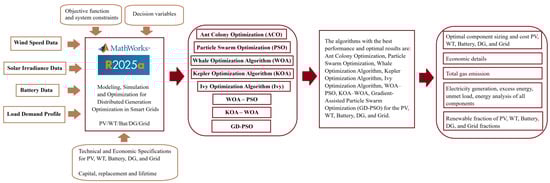 This study, as seen in Figure 1, examines the performance of five different metaheuristic optimization methods and three hybrid metaheuristic algorithms within a systematic and comparative analysis framework to optimize the energy management processes of DG systems integrated into smart grids. The study looked at how well eight optimization algorithms work for managing energy in smart grids, focusing on goals like lowering costs, using more renewable energy, and improving battery efficiency, while considering the complex nature of production planning. In this study, we propose an objective function designed to enhance the accuracy and realism of the optimization model. This is achieved by incorporating a penalty term that addresses deviations in the battery’s State of Charge (SOC) at the conclusion of the 24 h planning period. Then, we analyzed the aforementioned algorithms’ performance differences against deterministic and stochastic inputs in detail; we conducted a multi-criteria evaluation based on criteria such as solution quality, convergence speed, computational cost, and algorithmic stability. Additionally, the findings aim to provide decision-makers with a scientific reference framework for algorithm selection in designing and operating smart grid infrastructures. In this regard, the investigation, one of the rare studies, further illuminates interdisciplinary applications in renewable energy integration, battery management, and grid economics.
