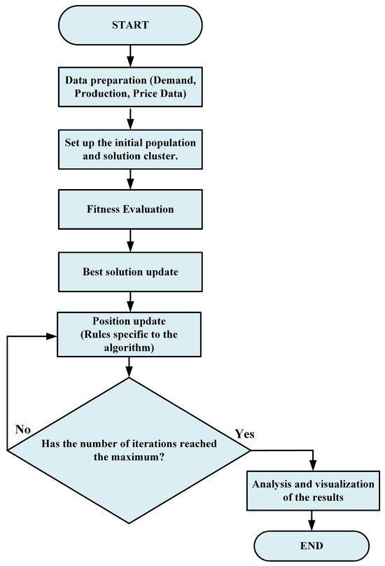 In this simulation study, we utilized traditional metaheuristic algorithms and hybrid metaheuristic algorithms derived from them to optimize the energy management system that integrates renewable energy sources, including solar and wind, along with battery systems. The optimization process aims to minimize the total energy cost based on time series data of demand, renewable energy production, and grid prices. Each of the employed algorithms determines the hourly values of energy supply and consumption parameters, including grid energy procurement, battery charging, and battery discharging, over a seven-day period. A flowchart illustrating the energy optimization process is shown in Figure 2.