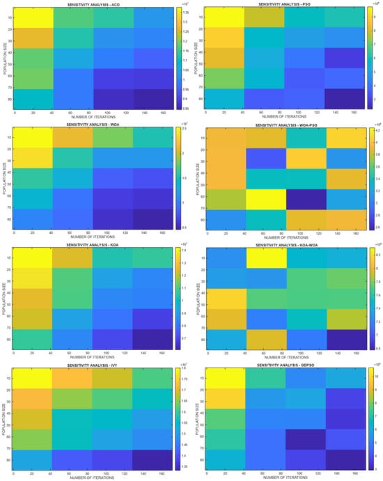 The performance of metaheuristic optimization algorithms is highly sensitive to their hyperparameters, such as population size and the number of iterations. Therefore, a comprehensive sensitivity analysis was conducted to assess how eight different algorithms react to variations in these parameters. This analysis is essential to reveal the robustness of the algorithms and to understand the impact of parameter selection on solution quality.