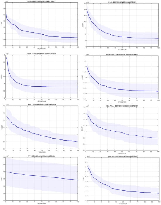 As a result, each algorithm was initially executed independently 30 times to evaluate performance based on the objective function. This phase included not only the assessment of final costs, but also sensitivity analyses with respect to population size and iteration count, as well as evaluations of convergence consistency across independent runs. These simulations revealed that different algorithms yield distinct solutions under identical system conditions, underlining the comparative strengths of both single and hybrid metaheuristic approaches.