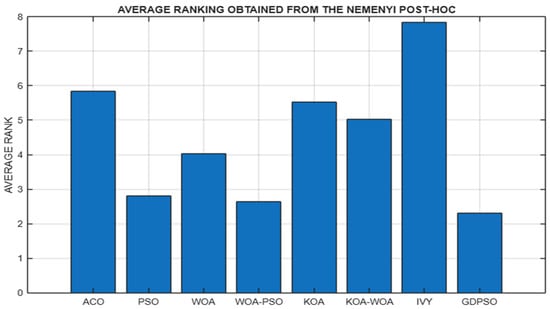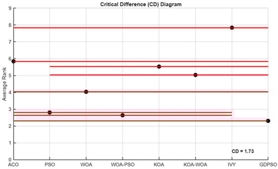 PSO exhibits relatively strong performance among classical methods, with low variability and a solid average ranking. Its global-best update mechanism efficiently guides particles toward promising regions. While it can suffer from premature convergence in complex problems, it still outperforms many alternatives like WOA, KOA, and ACO in this case.