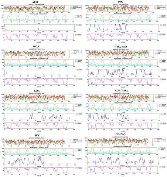Figure 7 illustrates the hourly energy flow dynamics over a randomly selected week (168 h) for all eight optimization methods. The figure comprises four subplots for each algorithm: energy distribution, renewable energy generation, state-of-charge (SOC) of the battery, and electricity price.