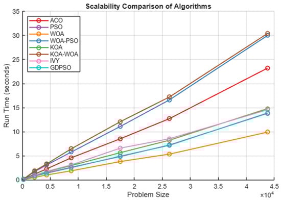 The scalability of the evaluated metaheuristic algorithms was further analyzed by measuring their computational run times across varying problem sizes, as depicted in Figure 8. Problem size was incrementally increased, and the corresponding execution times were recorded to assess how each algorithm’s performance scales with increasing complexity.